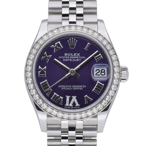 Experience refined elegance with this 2022 Rolex Datejust 31 (Model 278384RBR), presented in excellent condition. Crafted in steel and white gold, it showcases a diamond-set bezel and an aubergine dial with diamond Roman details, all protected by sapphire crystal. The 31mm case houses an automatic movement and is paired with a Jubilee bracelet in Oystersteel featuring a concealed clasp for a seamless fit. Water resistant to 100m, this ladies’ timepiece blends everyday versatility with unmistakable luxury. Supplied with Rolex box, original papers, and original white tag (BQ Ref 52330). Includes a 2 Year Warranty, 14 Day Return Policy, and Next Day Delivery.