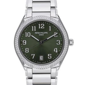 Discover timeless elegance with the Patek Philippe Twenty-4 Automatic 36mm, model 7300/1200A-011 (BQ Ref 52339). Presented in excellent 2022 condition, this ladies’ stainless-steel timepiece pairs a refined bracelet with a brilliant diamond-set bezel. The striking green dial with Arabic numerals sits beneath a durable sapphire crystal, while the automatic movement delivers effortless everyday precision. A secure folding clasp and 30M water resistance add comfort and practicality. Complete with original box and papers, this Twenty-4 is backed by a 2 Year Warranty, plus a 14 Day Return Policy and Next Day Delivery for a seamless ownership experience.