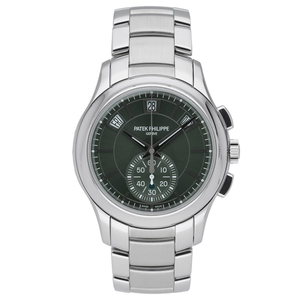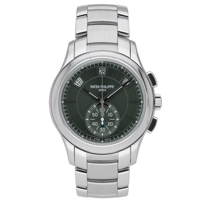 Presented in excellent condition, this Patek Philippe Annual Calendar (Ref. 5905/1A-001, BQ Ref 52294) features a striking green dial housed in a 42mm stainless steel case with a plain bezel and robust steel bracelet with folding clasp. Powered by a self-winding automatic movement, the annual calendar complication offers an elegant display of the day, date, and month, protected by a scratch-resistant sapphire crystal. Water resistant to 3 ATM, this 2021 gents’ model balances refined presence with everyday versatility. Supplied with its original box and papers, it is backed by our 2 Year Warranty for peace of mind, plus a 14 Day Return Policy and Next Day Delivery for a seamless purchase experience. A contemporary expression of Patek Philippe sophistication, ready for the collection and the wrist.