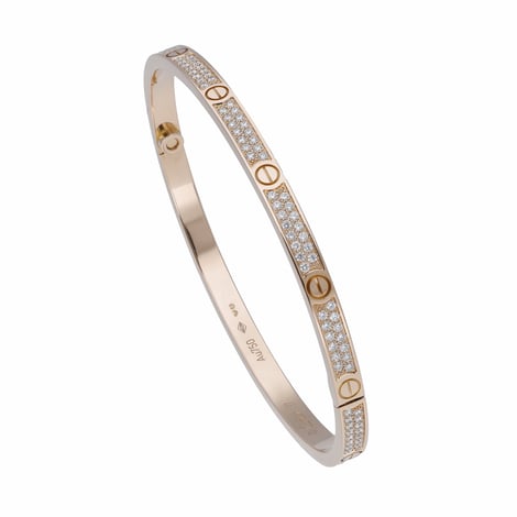 Cartier LOVE bracelet, small model pavé (BQ Ref 52343). Crafted in 18ct rose gold and fully pavé-set with sparkling brilliant-cut diamonds, this iconic piece showcases Cartier’s signature screw motif in a refined, wearable silhouette. Presented in excellent condition, it comes complete with Cartier box and original papers, making it an exceptional addition to any collection or a meaningful gift. A timeless symbol of enduring style, the small model offers elegant versatility for everyday wear or evening occasions. Enjoy the convenience of next day delivery and shop with confidence under our 14-day return policy.