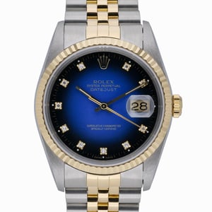 Experience timeless elegance with this Rolex Datejust 36 (ref. 16233), a 1991 steel and yellow gold example in excellent condition. Its striking blue, diamond-set dial is framed by a fluted yellow gold bezel and protected by scratch-resistant sapphire crystal. Powered by a reliable automatic movement, this gents’ Datejust features the iconic two-tone Jubilee bracelet with a secure folding clasp. Water resistant to 10 ATM, it offers refined versatility for everyday wear. Supplied with original box, papers, and green tag, BQ Ref 52345. Case size: 36mm. Includes a 2 Year Warranty, Next Day Delivery, and our 14 Day Return Policy.