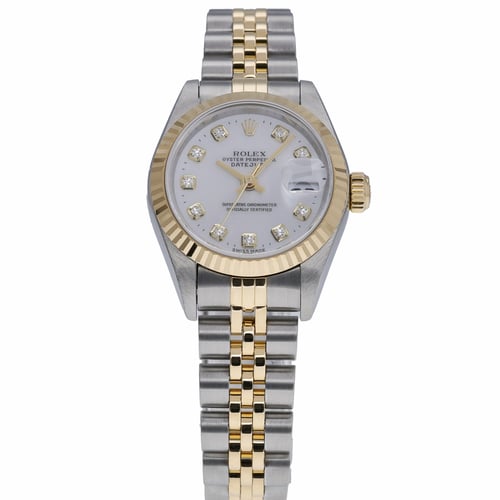 Timeless and refined, this ladies’ Rolex Datejust (Model 69173, BQ Ref 52344) pairs a 26mm steel and yellow gold case with a fluted bezel and Jubilee bracelet for iconic two‑tone elegance. The white diamond‑set dial sits beneath sapphire crystal and is powered by a reliable automatic movement. Presented in good condition, this 1996 example includes its box, original papers, and green tag. Features include a folding clasp and 10 ATM water resistance. Supplied with a 2 Year Warranty and covered by our 14 Day Return Policy, with Next Day Delivery available.