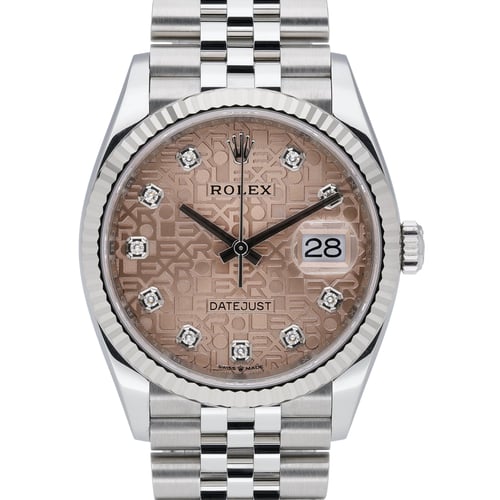 Timeless and versatile, the Rolex Datejust 36 (model 126234) pairs Oystersteel with 18 ct white gold for a refined 36mm case crowned by a signature fluted bezel. Presented in excellent condition, it showcases a striking Pink Jubilee dial with diamond hour markers beneath scratch-resistant sapphire crystal, powered by a reliable automatic movement. The Jubilee bracelet in Oystersteel with a secure folding clasp offers elegant comfort, while 100M water resistance ensures everyday practicality. Year 2019, supplied with original box, original papers, and white tag. An ideal gents choice for both daily wear and special occasions. Includes 2 Year Warranty, 14 Day Return Policy, and Next Day Delivery. BQ Ref: 52359.