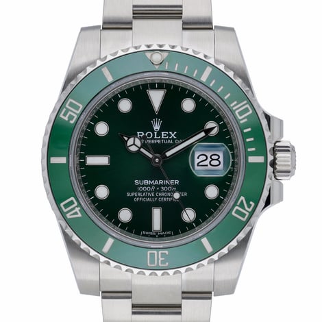 Rolex Submariner 116610LV “Hulk” (BQ Ref 52388) in Oystersteel, featuring a 40mm case and Oyster bracelet with Oysterlock clasp. The iconic green dial sits beneath scratch-resistant sapphire crystal, while the unidirectional rotatable bezel and automatic movement deliver the Submariner’s renowned dive-ready performance, including 300M water resistance. This 2019 example is in excellent condition and is supplied with its Rolex box, original papers, and original white tag. Backed by a 2 Year Warranty, a 14 Day Return Policy, and Next Day Delivery, this sought-after Submariner is ready for immediate wear.