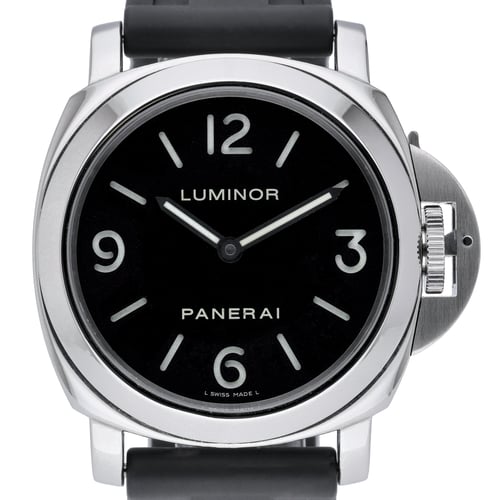 Iconic Panerai Luminor Base PAM00112 (BQ Ref 52371) in excellent condition, featuring a 44mm stainless steel case with plain bezel and a clean black Arabic dial under scratch‑resistant sapphire crystal. Powered by a dependable manual‑wind movement and rated to 300M water resistance, it pairs classic tool‑watch capability with everyday refinement. The leather strap with pin buckle ensures comfortable wear. Year of manufacture: 2014. Supplied with its box and original papers, plus a 2‑year warranty and our 14‑day return policy. Gents model. Next Day Delivery available.