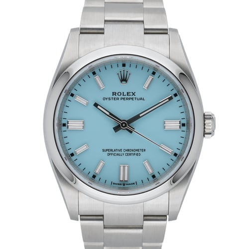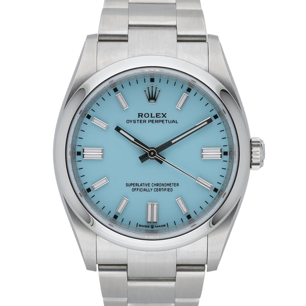 Presenting the Rolex Oyster Perpetual 36 (126000) with a striking Tiffany Blue baton dial, Year 2024, in excellent condition. Crafted in durable Oystersteel with a 36mm case, smooth domed bezel, and matching Oyster bracelet secured by an Oysterclasp, it features sapphire crystal and 100M water resistance. Powered by an automatic movement, this gents model embodies Rolex’s timeless precision and everyday versatility. Supplied as a complete set with Rolex box, original papers, and original white tag. Covered by a 5-year manufacturer’s warranty from the 2024 date of manufacture. Next day delivery available, with a 14-day return policy for peace of mind. BQ Ref: 52374.