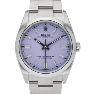 Rolex Oyster Perpetual 36 (126000), manufactured in 2025, presented in robust Oystersteel with a refined domed bezel and a distinctive Lavender baton dial. Powered by a precise automatic movement and protected by scratch‑resistant sapphire crystal, this new/unworn timepiece offers everyday versatility with 100 m water resistance. The classic 36 mm case is paired with the signature Oyster bracelet and secure Oysterclasp for enduring comfort and style. Supplied with Rolex box, original papers, and white tag, and backed by a 5-year manufacturer’s warranty from the 2025 date of manufacture. Enjoy next day delivery and a 14-day return policy for complete peace of mind. BQ Ref: 52373.