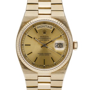 Presenting the Rolex Day-Date Oysterquartz ref. 19018 (BQ Ref 52370), a 36mm gents timepiece crafted in solid 18ct yellow gold with the iconic integrated Oysterquartz bracelet and concealed clasp. A fluted bezel surrounds the champagne baton dial beneath durable sapphire crystal, while the precise quartz movement ensures reliable, low-maintenance performance. Manufactured in 1964 and offered in good condition, this classic Day-Date delivers versatile elegance with 100M water resistance. Supplied with its original box and papers, it includes a 2 Year Warranty, a 14 Day Return Policy, and Next Day Delivery.