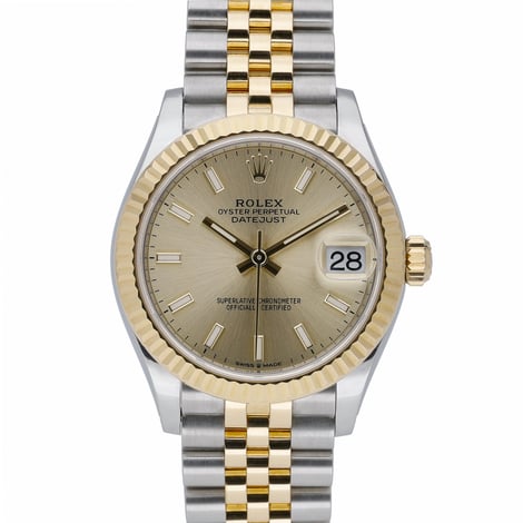 Rolex Datejust 31 (Model 278273) — a refined midsize classic in steel and yellow gold. This 31mm example from 2019 is in excellent condition and features a fluted bezel, champagne baton dial, and scratch‑resistant sapphire crystal. Powered by an automatic movement, it pairs elegance with everyday reliability, while the Jubilee bracelet with concealed clasp offers seamless comfort and style. Water resistant to 100M, this watch is supplied as a full set with box and original papers. Backed by a 2-year warranty and supported by our 14-day return policy, with next day delivery available. BQ Ref: 52431.