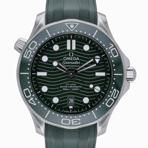 Omega Seamaster Diver 300M 210.32.42.20.10.001 in excellent condition, offering professional dive performance with refined style. This 2024 gents model features a 42mm stainless steel case, a striking green dial protected by sapphire crystal, and a unidirectional rotating bezel. Powered by an automatic movement and water resistant to 300m, it’s fitted with a comfortable green rubber strap secured by a pin buckle. Supplied with original box and papers and referenced under BQ Ref 52441. Includes a 5-year manufacturer’s warranty running from the 2024 date of manufacture, plus our 14-day return policy and next-day delivery.