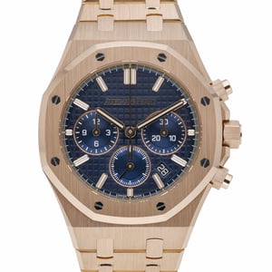 Experience the Audemars Piguet Royal Oak Chronograph, reference 26715OR.OO.1356OR.01 (BQ Ref 52432), a refined 38mm gents’ timepiece in 18ct rose gold with matching bracelet and secure folding clasp. Presented in excellent condition from 2023, it features a blue chronograph dial under scratch-resistant sapphire crystal and is powered by a reliable automatic movement. With 50M water resistance and a versatile case size, this Royal Oak balances everyday wearability with unmistakable prestige. Supplied with original box and papers, it is backed by our 2 Year Warranty and 14 Day Return Policy, and is available with Next Day Delivery.