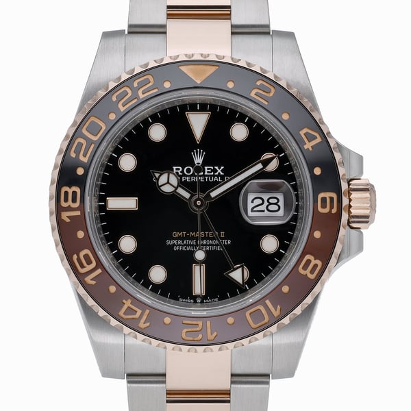 Presented in excellent condition, this 2020 Rolex GMT‑Master II “Root Beer” (Model 126711CHNR, BQ Ref 52402) blends steel and rose gold in a 40mm case with a black dial protected by sapphire crystal. Powered by an automatic movement, it features a bidirectional rotatable 24‑hour bezel, Oyster bracelet in matching steel and rose gold, and a secure Oysterlock clasp. Water resistant to 100M, it’s built for travel with iconic GMT capability and refined everyday durability. Supplied as a complete set with original box, papers, and white tag. Backed by our 2 Year Warranty, plus a 14 Day Return Policy and Next Day Delivery for your convenience.