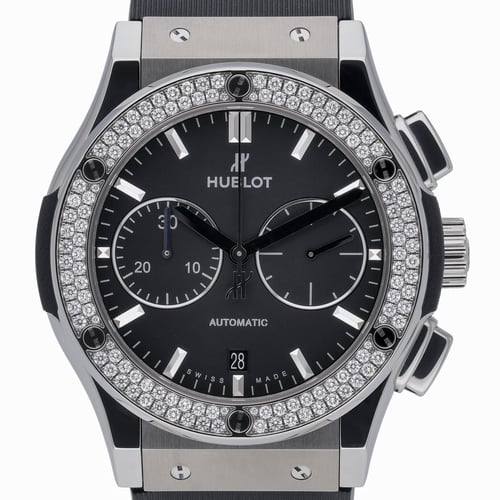 Refined and dynamic, the Hublot Classic Fusion Chronograph (BQ Ref 52479) features a 45mm lightweight titanium case with a diamond-set bezel, framing a black chronograph dial beneath scratch-resistant sapphire crystal. Powered by an automatic movement, it’s paired with a leather strap and secure folding clasp for comfortable, confident wear. Presented in excellent condition, this gents timepiece comes complete with its original box and papers and is water resistant to 5 ATM. Supplied with a 2-year warranty, next day delivery, and a 14-day return policy for complete peace of mind.