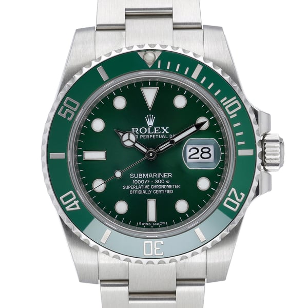 Rolex Submariner 116610LV “Hulk” (BQ Ref 52468), presented in excellent condition. The 40mm Oystersteel case pairs with an Oystersteel Oyster bracelet secured by an Oysterlock clasp. Its green dial sits beneath sapphire crystal and is complemented by a unidirectional rotatable bezel. Powered by an automatic movement and water resistant to 300M, this 2014 Submariner delivers the robust performance expected of a professional diver’s watch. Supplied with original box, original papers, and original white tag. Includes a 2 Year Warranty, Next Day Delivery, and a 14 Day Return Policy.