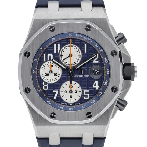 Presenting the Audemars Piguet Royal Oak Offshore (BQ Ref 52471, ref. 26470ST.OO.A027CA.01), a 42mm steel chronograph in excellent condition. Powered by an automatic movement, it features a striking blue dial, sapphire crystal, and a fixed bezel, paired with a durable blue rubber strap and pin buckle. Water resistant to 10 ATM, this 2017 gents model embodies the Offshore’s bold sport-luxe character while delivering everyday versatility. Supplied with its box and backed by our 2 Year Warranty, it’s ready for immediate enjoyment with Next Day Delivery and the reassurance of a 14 Day Return Policy.