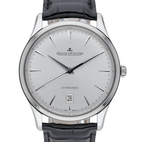 The Jaeger-LeCoultre Master Ultra Thin Date (Q1238420) balances understated luxury and precision. Its 39mm stainless steel case with a smooth bezel frames a silver baton dial protected by sapphire crystal, while an automatic movement keeps impeccable time. New/Unworn and manufactured in 2026, it is presented on a supple alligator strap with a secure folding clasp and offers everyday practicality with 5 ATM water resistance. Supplied with original box and papers (BQ Ref 52474). Includes a 5-year manufacturer’s warranty counted from the 2026 date of manufacture, plus our 14-day return policy and next day delivery.