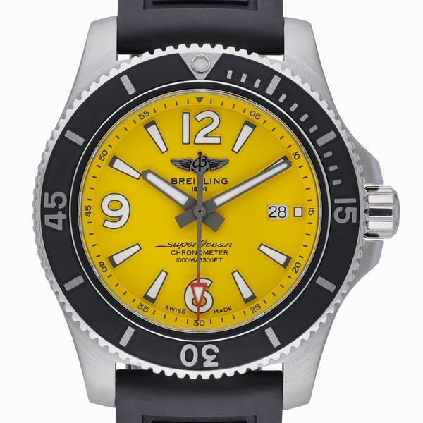 Discover the Breitling SuperOcean 44 (Model A173670), a robust 44mm gents’ diver in steel with a striking yellow dial. Powered by an automatic movement and protected by sapphire crystal, it features a unidirectional rotatable bezel and exceptional 100 ATM water resistance. The watch is fitted to a durable rubber strap with a folding clasp for secure, comfortable wear. Presented in excellent condition and dated 2021, this example is supplied with its original box and papers. Please note: this watch has aftermarket alterations. BQ Ref: 52533. Enjoy peace of mind with a 2 Year Warranty, plus our 14 Day Return Policy and Next Day Delivery.