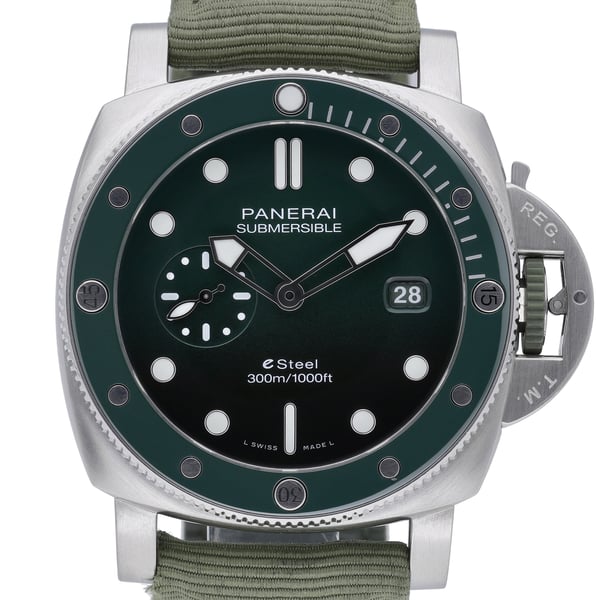 Discover the Panerai Submersible QuarantaQuattro PAM01287, a robust 44mm diver crafted in brushed eSteel and presented in excellent condition. Powered by an automatic movement, it features a plain green dial beneath sapphire crystal, a unidirectional rotatable bezel, and 300 m water resistance for uncompromising performance. The eco-conscious build is complemented by a recycled PET strap with a pin buckle. This 2022 example arrives complete with box and original papers (BQ Ref 52539) and includes a 2 Year Warranty. A confident choice for gents seeking tool-watch capability with modern sustainability, it delivers Panerai’s signature presence with everyday versatility. Enjoy Next Day Delivery and shop with confidence under our 14 Day Return Policy.