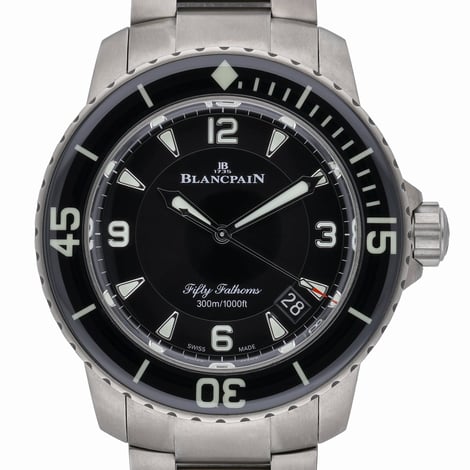 Blancpain’s iconic Fifty Fathoms, ref. 5015-12B30-B52A (BQ Ref 52545), combines professional dive capability with refined engineering. Crafted in lightweight titanium with a matching bracelet and secure folding clasp, its 45mm case frames a black Arabic dial protected by sapphire crystal. A unidirectional rotatable bezel and 300M water resistance underscore its tool‑watch pedigree, while the automatic movement delivers reliable performance day after day. This 2023 example is in excellent condition and is offered complete with original box and papers. A standout choice for those who want the heritage of the pioneering modern dive watch in a contemporary, wear-anywhere configuration. Supplied with a 2 Year Warranty, 14 Day Return Policy, and Next Day Delivery.