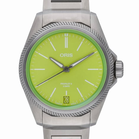 Playful yet precision-focused, the Oris Pro Pilot x Kermit (Model 01 400 7778 7157) pairs a striking green baton dial with a lightweight 39mm titanium case and matching titanium bracelet. Its fluted bezel, sapphire crystal, and 100M water resistance make it a capable daily companion, while the automatic movement and secure folding clasp deliver dependable performance and comfort. This 2024 example is in excellent condition and is supplied with its original box and papers. Backed by our 2 Year Warranty and a 14 Day Return Policy, it’s ready for immediate wear and enjoyment. BQ Ref: 52535. Next Day Delivery available.