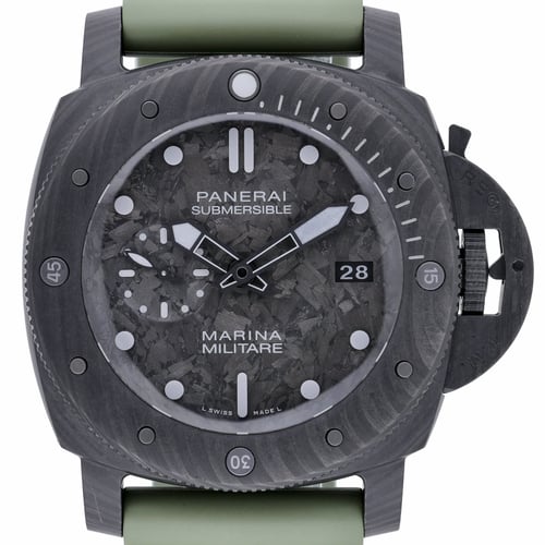Panerai Submersible Marina Militare PAM02979 pairs professional dive performance with bold Italian design. Presented in excellent 2022 condition, this 47mm model features a lightweight, rugged carbon case, a clean black dial under scratch‑resistant sapphire crystal, and a unidirectional rotating bezel for precise timing. Its automatic movement ensures reliable timekeeping, while the rubber strap with pin buckle offers secure comfort in and out of the water. With 300M water resistance, it’s engineered for serious aquatic use. Supplied with Panerai box and original papers, and identified by BQ Ref 52577, this watch is covered by a 2 Year Warranty. Enjoy Next Day Delivery and a 14 Day Return Policy for added peace of mind.