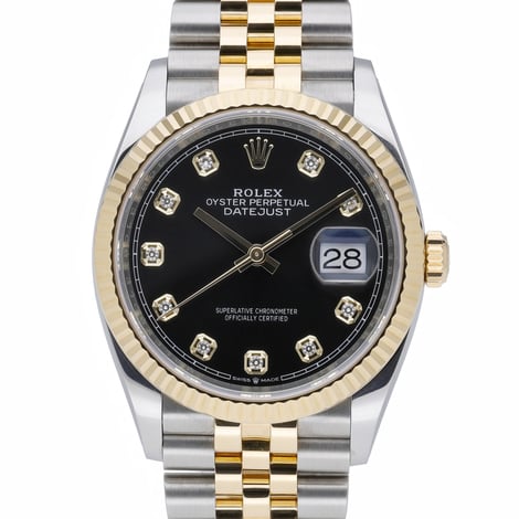 Elevate your collection with this Rolex Datejust 36 (ref. 126233), a 2021 steel and yellow gold example showcasing a striking black dial with diamond hour markers and the signature fluted bezel. Presented in excellent condition, it features the elegant Jubilee bracelet with Oysterclasp and is powered by a reliable automatic movement. The 36mm case is guarded by sapphire crystal and offers 100M water resistance, making it a refined choice for everyday wear or special occasions. Supplied with its original Rolex box, papers, and white tag, this piece arrives with a 2 Year Warranty and is covered by our 14 Day Return Policy. Enjoy Next Day Delivery for swift, secure shipping. BQ Ref: 52596.