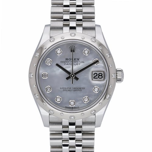 Presenting the Rolex Datejust 31 (ref. 278344RBR), a ladies’ timepiece that balances enduring elegance with everyday performance. Crafted in Oystersteel and paired with a Jubilee bracelet and folding clasp, this 31mm model showcases a mother-of-pearl dial with diamond hour markers, framed by a factory diamond-set bezel. Powered by a precise automatic movement beneath a scratch-resistant sapphire crystal, it offers 100m water resistance for confident daily wear. This 2022 example is in excellent condition and is supplied with its original box, papers, and white tag. Covered by Rolex’s 5-year manufacturer’s warranty from the date of manufacture, it delivers lasting peace of mind. BQ Ref: 52588. Next Day Delivery available and supported by our 14 Day Return Policy.