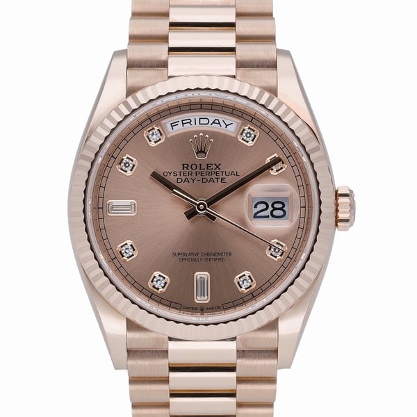 Presenting the Rolex Day-Date 36 (ref. 128235), crafted in 18ct rose gold with a fluted bezel and the iconic President bracelet with concealed clasp. This 2022 example features a rose dial set with diamonds, protected by sapphire crystal, and is powered by an automatic movement. Sized at a versatile 36mm (midsize) and water resistant to 100M, it combines everyday practicality with unmistakable prestige. In excellent condition, it comes complete with its original box, papers, and white tag. Covered by Rolex’s 5-year manufacturer’s warranty from its 2022 date of manufacture, this piece offers peace of mind alongside timeless style. Enjoy Next Day Delivery and a 14 Day Return Policy. BQ Ref: 52646.