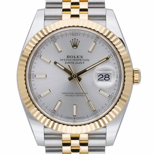 Rolex Datejust 41 (126333) in steel and 18 ct yellow gold, featuring a 41 mm case with fluted bezel and a silver baton dial beneath scratch‑resistant sapphire crystal. Powered by an automatic movement, this 2025 example is in excellent condition and comes complete with Rolex box, original papers, and white tag; protective stickers are present. The two‑tone Jubilee bracelet with Oyster clasp delivers refined comfort and daily versatility, complemented by 100 m water resistance. Covered by the Rolex 5‑year manufacturer’s warranty from the 2025 date of manufacture. BQ Ref: 52637. Next Day Delivery available and supported by our 14 Day Return Policy.