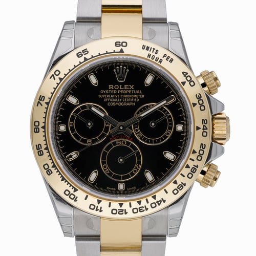 Presenting the Rolex Daytona ref. 116503, a New Old Stock (2017) two-tone icon in Steel & Yellow Gold. The 40mm case frames a black chronograph dial beneath scratch-resistant sapphire crystal, while the tachymetric scale bezel and Oyster bracelet with Oysterlock clasp underscore its sporting pedigree. Powered by an automatic movement and water resistant to 100m, this gents’ Daytona delivers precision and everyday durability. Supplied with its original Rolex box, papers, and white tag (BQ Ref 52629), and covered by our 2 Year Warranty. Enjoy Next Day Delivery and a 14 Day Return Policy.