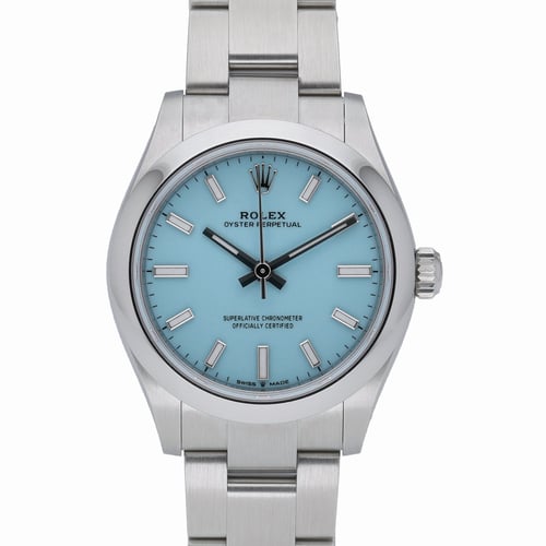Discover the Rolex Oyster Perpetual 31, model 277200 (BQ Ref 52626), a refined midsize expression of Rolex’s pure design. Crafted in durable Oystersteel, it features a 31mm case with a domed bezel, a striking turquoise baton dial protected by sapphire crystal, and the signature Oyster bracelet secured by an Oysterclasp. Powered by an automatic movement and water resistant to 100 meters, this 2026 example is New/Unworn and supplied complete with original Rolex box, papers, and white tag. A 5-year manufacturer’s warranty applies from the 2026 date of manufacture. Next Day Delivery and a 14 Day Return Policy included.