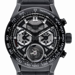 Experience avant‑garde watchmaking with the Tag Heuer Carrera 02T Tourbillon Chronograph (model CAR5A90.FC6415). This 45mm 2018 piece features a lightweight black ceramic case, grey skeleton dial, and tachymetric bezel, showcasing the automatic tourbillon chronograph movement beneath a scratch‑resistant sapphire crystal. Water resistant to 10 ATM and secured on a leather strap with a folding clasp, it blends high performance with refined sport aesthetics. Presented in excellent condition and complete with original box and papers, BQ Ref 52695. Supplied with a 2 Year Warranty, plus Next Day Delivery and a 14 Day Return Policy.