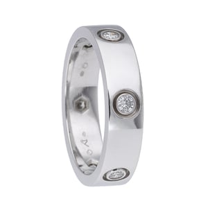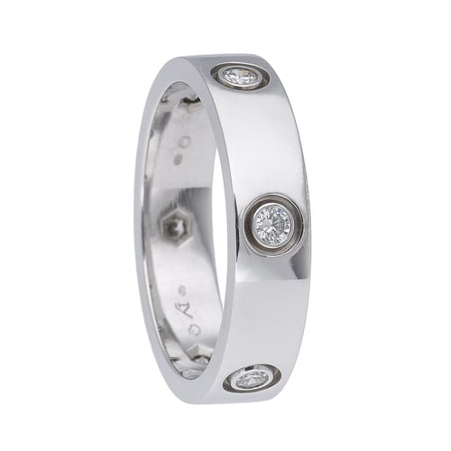 This ring is - SIZE 64. Cartier Love Ring, 1997 edition, crafted in 18ct white gold and set with six sparkling diamonds. This iconic design, distinguished by its signature screw motifs, is a timeless symbol of style. Presented in good condition, the ring shows a refined lustre with crisp lines and a brilliant diamond accent that elevates everyday wear. A coveted piece from Cartier’s most recognisable collection, perfect for adding understated luxury to any look. BQ Ref: 52678. Enjoy next day delivery and our 14-day return policy for peace of mind.