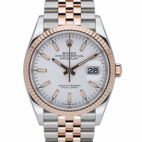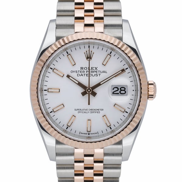 Refined and versatile, this 2022 Rolex Datejust 36 (ref. 126231; BQ Ref 52742) pairs steel and rose gold for timeless appeal. The 36mm case with fluted bezel frames a crisp white dial beneath sapphire crystal, powered by an automatic movement. Presented on the steel and rose gold Jubilee bracelet with Oysterclasp, it offers 100M water resistance for everyday confidence. In excellent condition and complete with original box, papers and white tag, this classic gents model is an ideal balance of elegance and performance. Supplied with a 2 Year Warranty, 14 Day Return Policy, and Next Day Delivery.