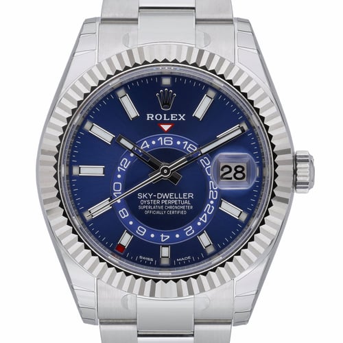 Rolex Sky-Dweller 326934 in Oystersteel and 18 ct white gold, featuring a striking blue dial with annual calendar functionality and dual time display. The 42mm case is topped with a signature fluted bezel and protected by sapphire crystal, while the Oyster bracelet with Oysterclasp ensures secure, everyday comfort. Powered by an automatic movement and water resistant to 100M, this 2021 example is unworn with factory stickers. Supplied as a complete set with Rolex box, original papers, and original white tag. Includes a 2 Year Warranty, Next Day Delivery, and our 14 Day Return Policy. BQ Ref: 52714.