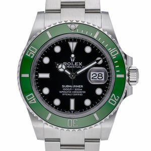 The Rolex Submariner “Starbucks” (Model 126610LV) is a 2024 gents timepiece in excellent condition, showcasing a 41mm Oystersteel case with a unidirectional rotatable bezel and a clean black dial protected by sapphire crystal. Powered by an automatic movement and water resistant to 300M, it’s paired with the robust Oystersteel Oyster bracelet and secure Oysterlock clasp for dependable everyday wear. Supplied with Rolex box, original papers, and white tag (BQ Ref 52730), this watch includes a 5-year manufacturer’s warranty counted from the 2024 date of manufacture. Enjoy added peace of mind with our 14-day return policy and the convenience of next day delivery.