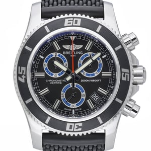 Experience uncompromising performance with this Breitling Superocean Chronograph M2000 (A73310), a 46mm stainless steel diver in excellent condition. Powered by a precise quartz movement, it features a black chronograph dial beneath sapphire crystal, a unidirectional rotating bezel, and exceptional water resistance rated over 120 ATM. The robust rubber strap with pin buckle delivers secure comfort in and out of the water. Manufactured in 2014, this gents model comes complete with its original box and papers and is backed by our 2 Year Warranty. BQ Ref 52727. Enjoy next day delivery and a 14 day return policy for total peace of mind.