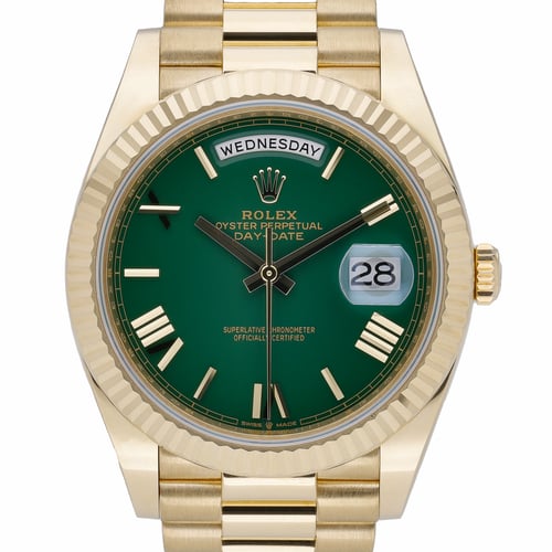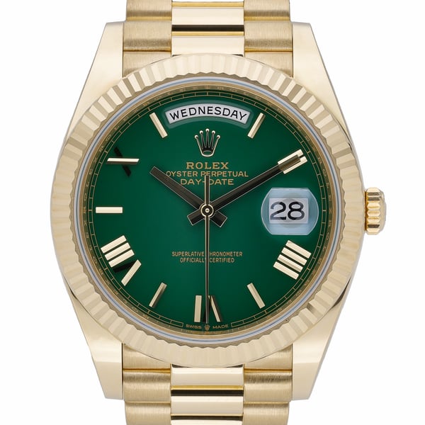 Presenting the Rolex Day-Date 40 (ref. 228238), crafted in solid 18ct yellow gold and offered in excellent 2023 condition. This distinguished gents timepiece features a striking green Roman dial beneath sapphire crystal, framed by a fluted bezel. The 40mm case houses a reliable automatic movement and is paired with the iconic President bracelet and a secure folding clasp for refined comfort. Water resistant to 100M, it balances everyday practicality with unmistakable prestige. Supplied as a complete set with original box and papers (BQ Ref 52709), this watch includes our 2 Year Warranty, Next Day Delivery, and a 14 Day Return Policy for added peace of mind.