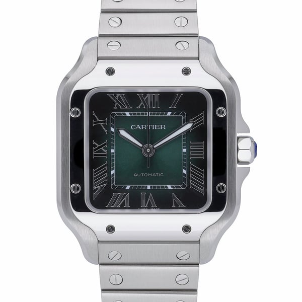 Discover the Cartier Santos WSSA0061, a 35mm stainless-steel icon pairing a striking green Roman dial with a reliable automatic movement. Crafted in 2024 and presented in excellent condition, it features a plain bezel, sapphire crystal, and a steel bracelet with folding clasp, offering everyday durability and 100M water resistance. Supplied with its Cartier box and original papers (BQ Ref 52842), this timepiece is backed by a 2-year warranty and a 14-day return policy for complete peace of mind. A refined choice for gents, the Santos blends heritage design with modern performance—available now with Next Day Delivery.