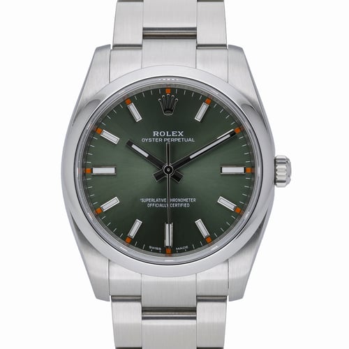The Rolex Oyster Perpetual 34 (Ref. 114200) showcases a vibrant green baton dial within a 34mm Oystersteel case topped by a smooth domed bezel, paired with the signature Oyster bracelet and folding clasp. Powered by Rolex’s automatic movement and protected by scratch-resistant sapphire crystal, it offers everyday reliability with 100m water resistance. This 2019 midsize example is in excellent condition and is supplied complete with its box, original papers, and green tag. Includes a 2-year warranty, next day delivery, and a 14-day return policy. BQ Ref: 52848.