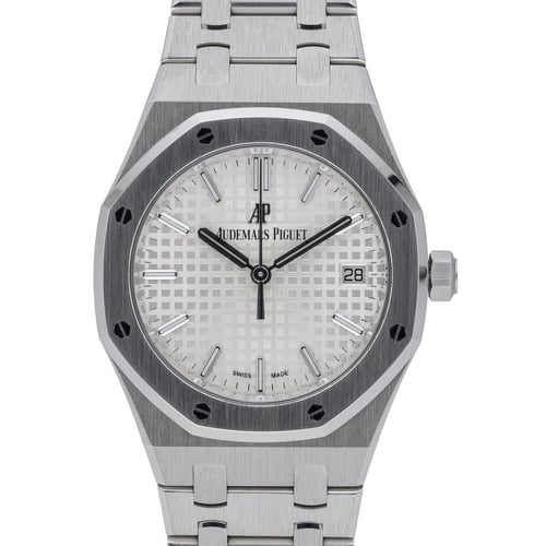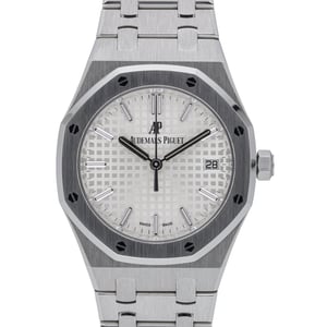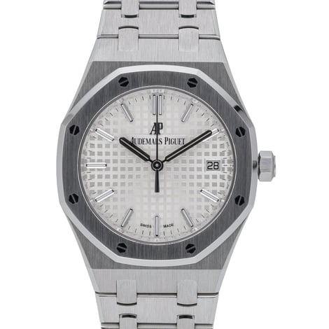 Audemars Piguet Royal Oak (Ladies), 34mm, 2022. This elegant stainless-steel reference pairs the Royal Oak’s iconic silhouette with a crisp white baton dial under sapphire crystal. Powered by a reliable automatic movement and secured with a steel bracelet and folding clasp, it offers refined versatility for daily wear. Presented in excellent condition, this example is supplied as a complete set with its original box and papers. Bezel type: plain; case and bracelet: steel. BQ Ref: 52844. Available with next day delivery.