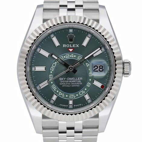 Presenting the Rolex Sky-Dweller 336934 — a 42mm statement of refined functionality. This new/unworn 2026 example pairs a robust Oystersteel Jubilee bracelet with an Oysterclasp and a Steel & White Gold case crowned by a signature fluted bezel. A vivid green dial showcases the model’s annual calendar display beneath scratch-resistant sapphire crystal, powered by a precise automatic movement and protected to 100m water resistance. Supplied as a complete set with original box, papers and white tag, BQ Ref 52832. Backed by Rolex’s 5-year manufacturer’s warranty from the 2026 date of manufacture, this Sky-Dweller blends everyday resilience with elevated luxury. In stock for next day delivery and covered by our 14-day return policy.