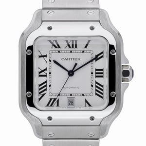 Elevate your collection with this 2024 Santos de Cartier, reference WSSA0018, presented in excellent condition. The 40mm stainless steel case showcases the iconic, plain Santos bezel and a refined silver dial with Roman numerals beneath scratch‑resistant sapphire crystal. Powered by an automatic movement and water resistant to 100M, it’s paired with a robust steel bracelet and secure folding clasp for everyday elegance. Supplied with original box and papers, this gents model is backed by our 2 Year Warranty and protected by a 14 Day Return Policy. Enjoy fast, Next Day Delivery. BQ Ref: 52794.