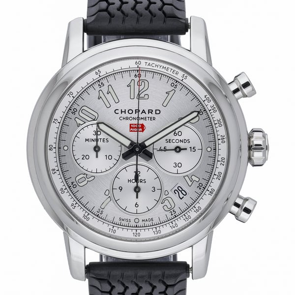 Celebrate the spirit of classic motoring with the Chopard Mille Miglia, ref. 8589. Presented in excellent condition, this 2018 gents’ model features a 42mm stainless steel case, silver Arabic dial, and scratch-resistant sapphire crystal. Its dependable automatic movement pairs with a plain bezel and a racing-inspired rubber strap secured by a pin buckle, offering comfort and style in equal measure. Water resistant to 50 metres, it’s a refined everyday companion with performance pedigree. Supplied with box, this watch is backed by our 2 Year Warranty and 14 Day Return Policy. Next Day Delivery available. BQ Ref: 52828.