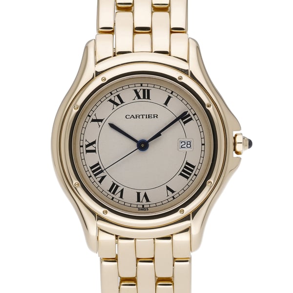 Crafted in 18ct yellow gold, this 33mm Cartier Cougar (Model 887904, BQ Ref 52830) embodies refined elegance with everyday versatility. The white Roman dial is framed by a plain bezel and protected by scratch‑resistant sapphire crystal, while an integrated 18ct yellow gold bracelet with folding clasp completes the classic Cartier aesthetic. Powered by a reliable quartz movement and water resistant to 30M, it offers effortless accuracy and confidence. Dated to 1994 and presented in excellent condition, this gents’ timepiece is supplied with its Cartier box and original papers. Your purchase includes a 2 Year Warranty, Next Day Delivery, and a 14 Day Return Policy for complete peace of mind. A timeless Cartier icon with enduring style, ready to wear and enjoy.