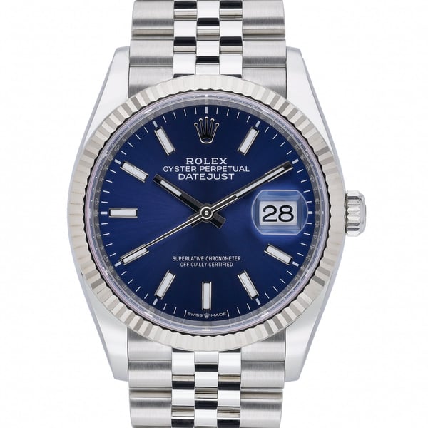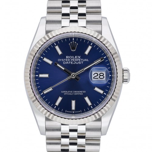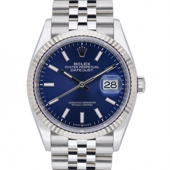 Timeless and versatile, the Rolex Datejust 36 ref. 126234 pairs an Oystersteel case and Jubilee bracelet with a signature white gold fluted bezel. Its striking blue baton dial sits beneath scratch‑resistant sapphire crystal, powered by a precise automatic movement and secured with a folding clasp. Measuring 36mm and water resistant to 100M, this 2025 example is in excellent condition and offers everyday robustness with refined elegance. Supplied with original box, papers, and white tag, it is covered by the Rolex 5‑year manufacturer’s warranty from the 2025 date of manufacture. Enjoy peace of mind with our 14 Day Return Policy and the convenience of Next Day Delivery. BQ Ref: 52772.