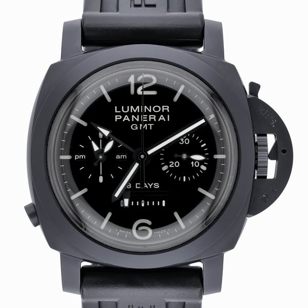 Experience the Panerai Luminor 1950 8 Days Chrono Monopulsante GMT (PAM00317), a 44mm gents timepiece in matte black ceramic with the signature crown‑protecting bridge. Powered by a manual-wind movement delivering an impressive eight-day reserve, it features a monopusher chronograph and practical GMT function for dual-time tracking. The black dial is protected by scratch-resistant sapphire crystal, and the watch is water resistant to 100M. Presented on a durable rubber strap with a pin buckle, this 2012 example is in excellent condition and is supplied with its box. Backed by our 2 Year Warranty, plus a 14 Day Return Policy and Next Day Delivery for added peace of mind. BQ Ref: 52782.