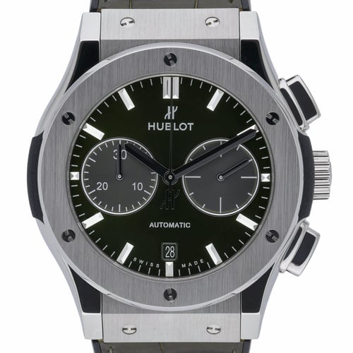 The Hublot Classic Fusion Chronograph (Model 521.NX.8970.LR, BQ Ref 52931) blends contemporary sportiness with refined craftsmanship. Its 45mm titanium case with a plain bezel and scratch‑resistant sapphire crystal showcases a striking green chronograph dial, powered by a reliable automatic movement. A leather strap with a deployment clasp ensures secure, comfortable wear, while 50M water resistance suits everyday versatility. Manufactured in 2020 and presented in excellent condition, this gents’ timepiece is supplied with its original box and papers for complete peace of mind. Backed by a 2 Year Warranty, plus our 14 Day Return Policy and Next Day Delivery, the Classic Fusion Chronograph offers the distinctive Hublot aesthetic with modern performance and enduring style.