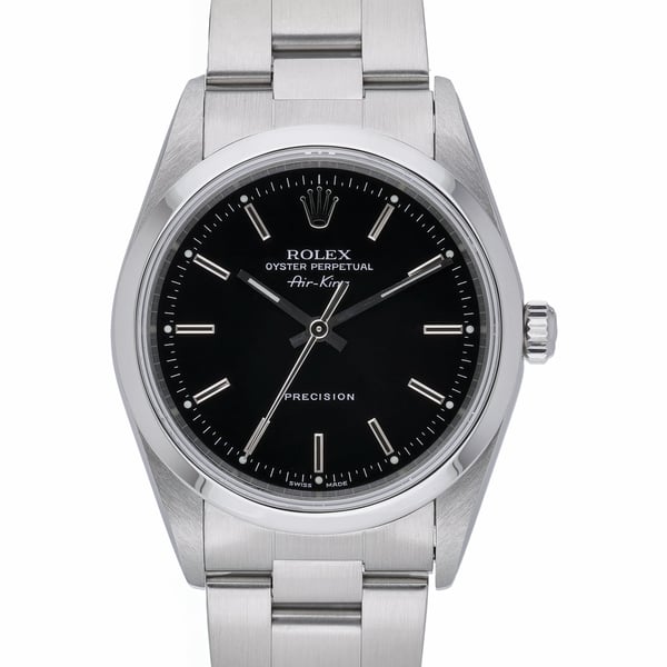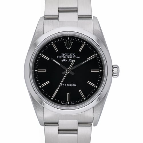 Rolex Air-King 14000M — a timeless 34mm Oystersteel classic from 2000, presented in excellent condition. Powered by an automatic movement, it showcases a clean black baton dial beneath scratch-resistant sapphire crystal, framed by a smooth bezel. The robust Oyster case and matching Oyster bracelet with Oyster clasp provide enduring comfort and reliability, complemented by 100M water resistance for everyday versatility. This complete set includes the original Rolex box, papers, and green tag. Backed by our 2 Year Warranty and 14 Day Return Policy, with insured Next Day Delivery for your convenience. BQ Ref: 52904.
