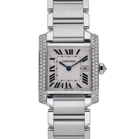 Elevate your collection with this Cartier Tank Francaise, model 2465, a timeless blend of Parisian elegance and everyday practicality. Presented in excellent condition, it features a 25mm midsize stainless steel case and bracelet with a secure folding clasp, framed by a diamond-set bezel that adds refined brilliance. The crisp white dial with classic Roman numerals sits beneath scratch-resistant sapphire crystal, while a reliable quartz movement ensures effortless precision. Manufactured in 2005, this piece is water resistant to 30M and offered with its Cartier box. BQ Ref: 52926. Enjoy peace of mind with our 2 Year Warranty, plus the convenience of Next Day Delivery and a 14 Day Return Policy. A definitive icon, perfectly sized for versatile, sophisticated wear.